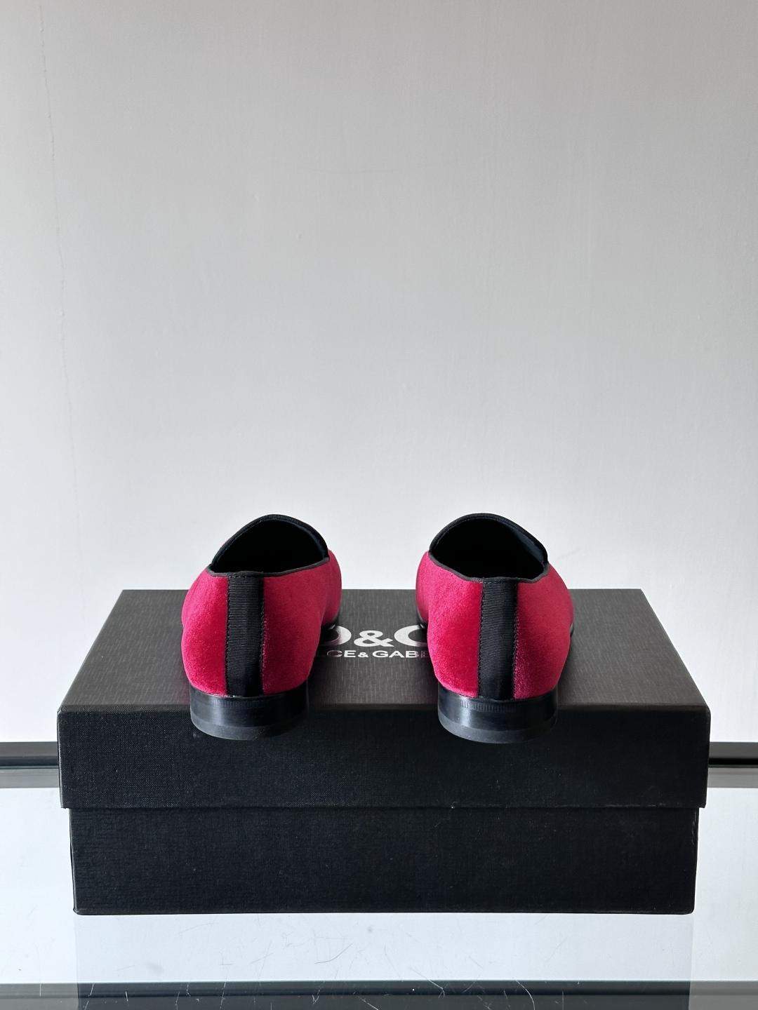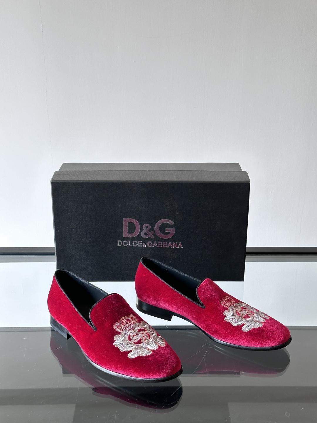 High-quality Dolce & Gabbana velvet replica slippers with coat of arms embroidery. A luxury replica shoe crafted for elegance and sophistication.