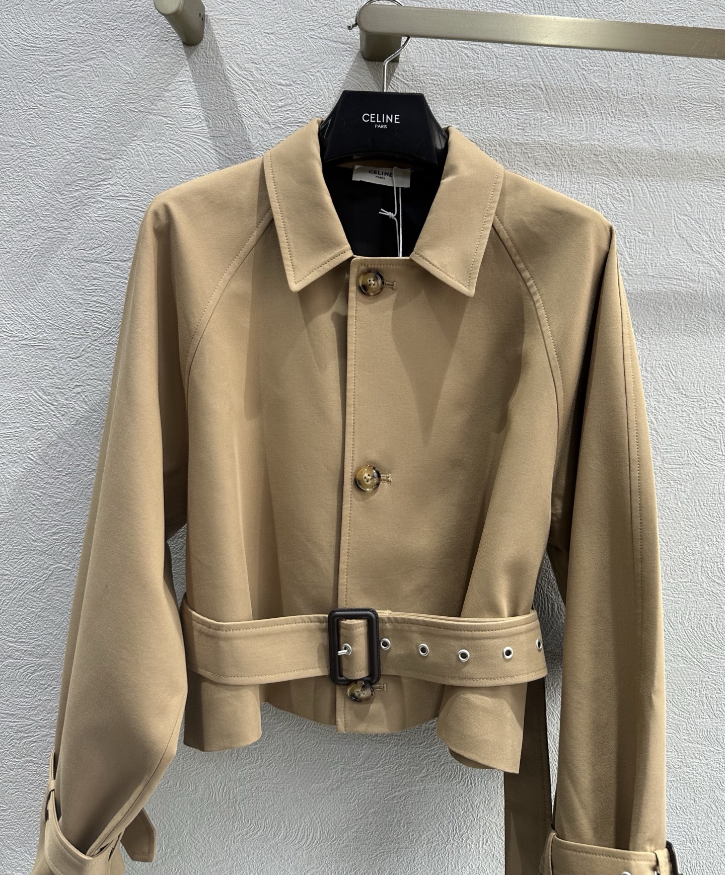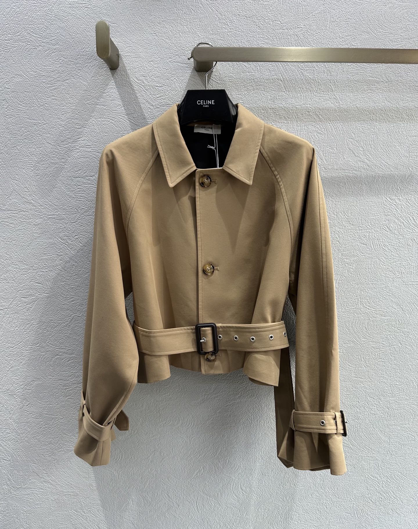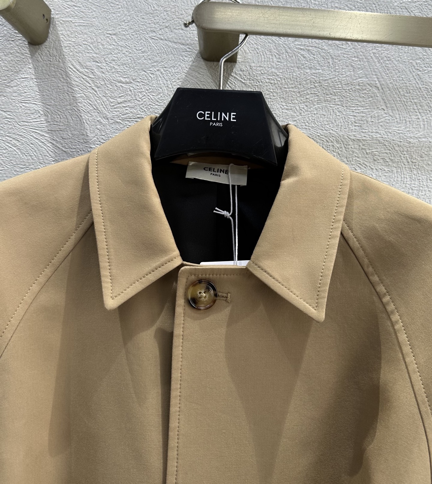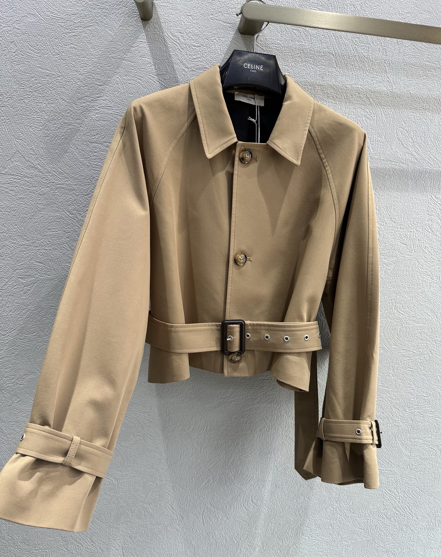 Crafted from cotton and wool gabardine, the Celine Replica Jacket offers durability, structure, and comfort. Gabardine fabrics are known for their tightly woven texture and smooth finish, which help garments maintain their shape while providing a refined appearance. The blend of cotton and wool creates a balanced material that feels soft while remaining structured and durable.