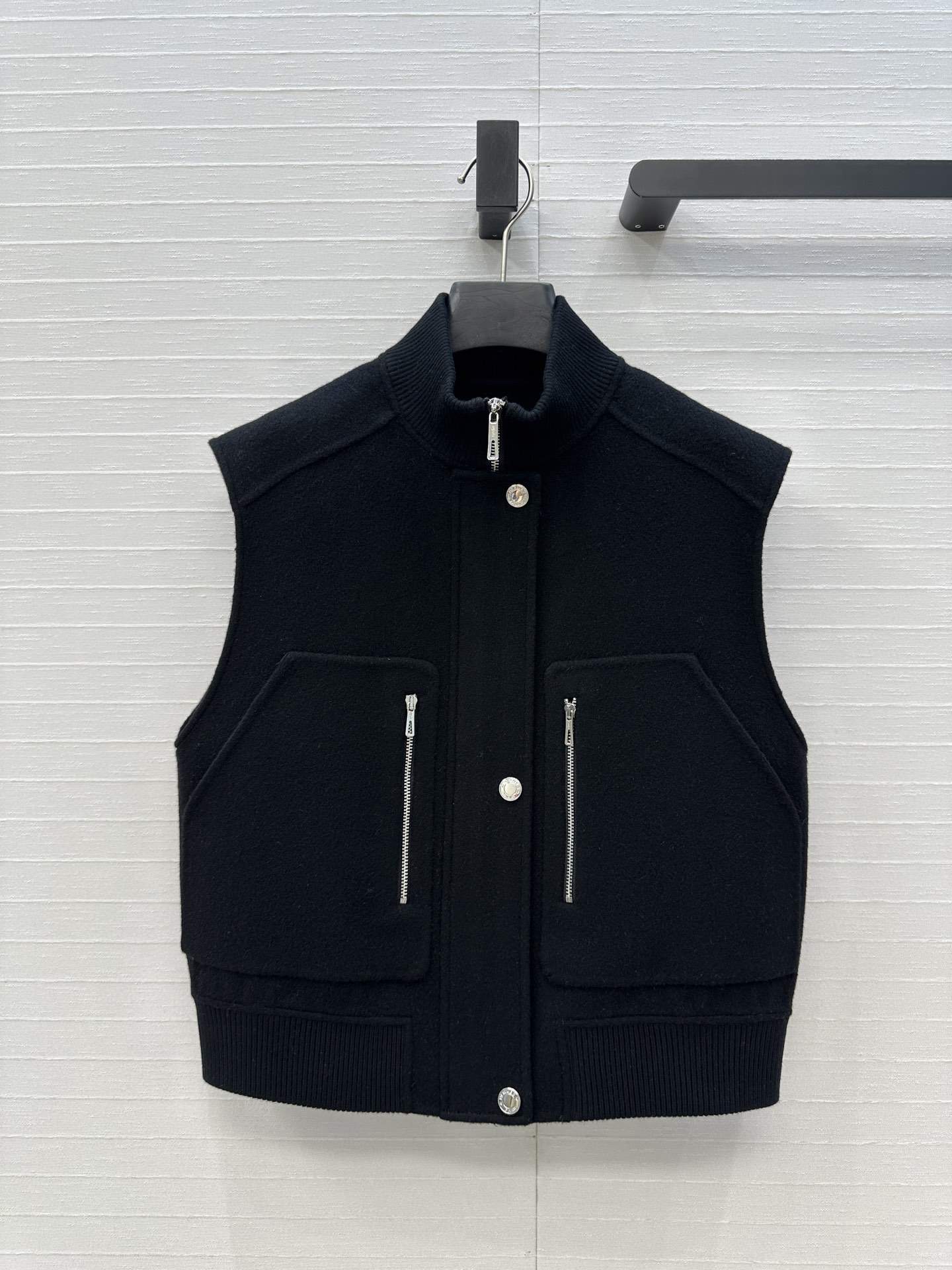 The sleeveless design allows freedom of movement and versatile styling. Moreover, the short cut enhances a modern silhouette while maintaining a polished look. Because of its balanced construction, the jacket layers easily over shirts, sweaters, or dresses. The secure front closure adds functionality without compromising style.