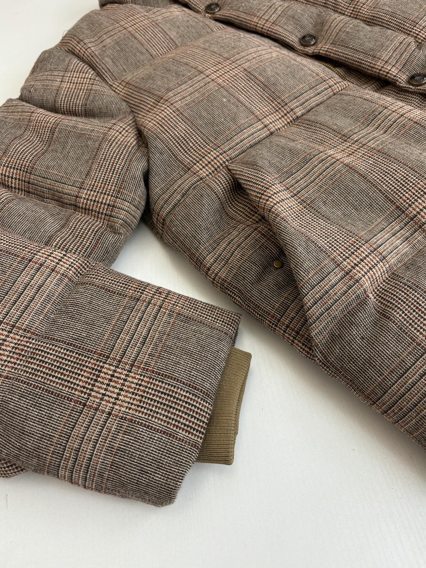 This exact copy replica blouson is crafted from tweed-effect fabric with soft, down-like padding. The material feels smooth, lightweight, and warm. At the same time, it maintains its structure and shape throughout daily use. Because of this construction, the jacket offers excellent insulation without feeling bulky.