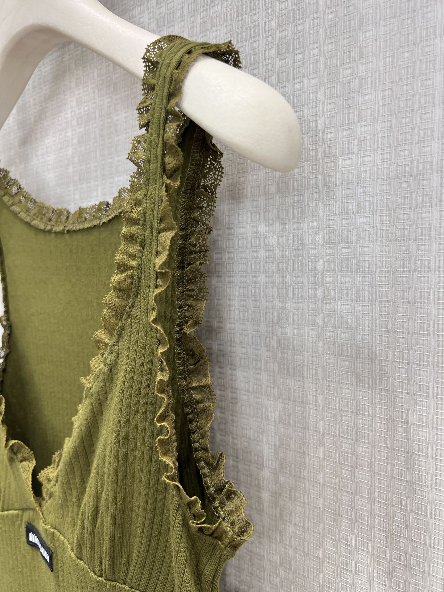 Designers crafted this Miu Miu mini dress with a fitted silhouette that highlights your natural shape. The structure creates a balanced and flattering look without feeling tight. Lace detailing on the neckline adds a delicate and stylish touch. The V-neck design enhances the overall feminine feel.
