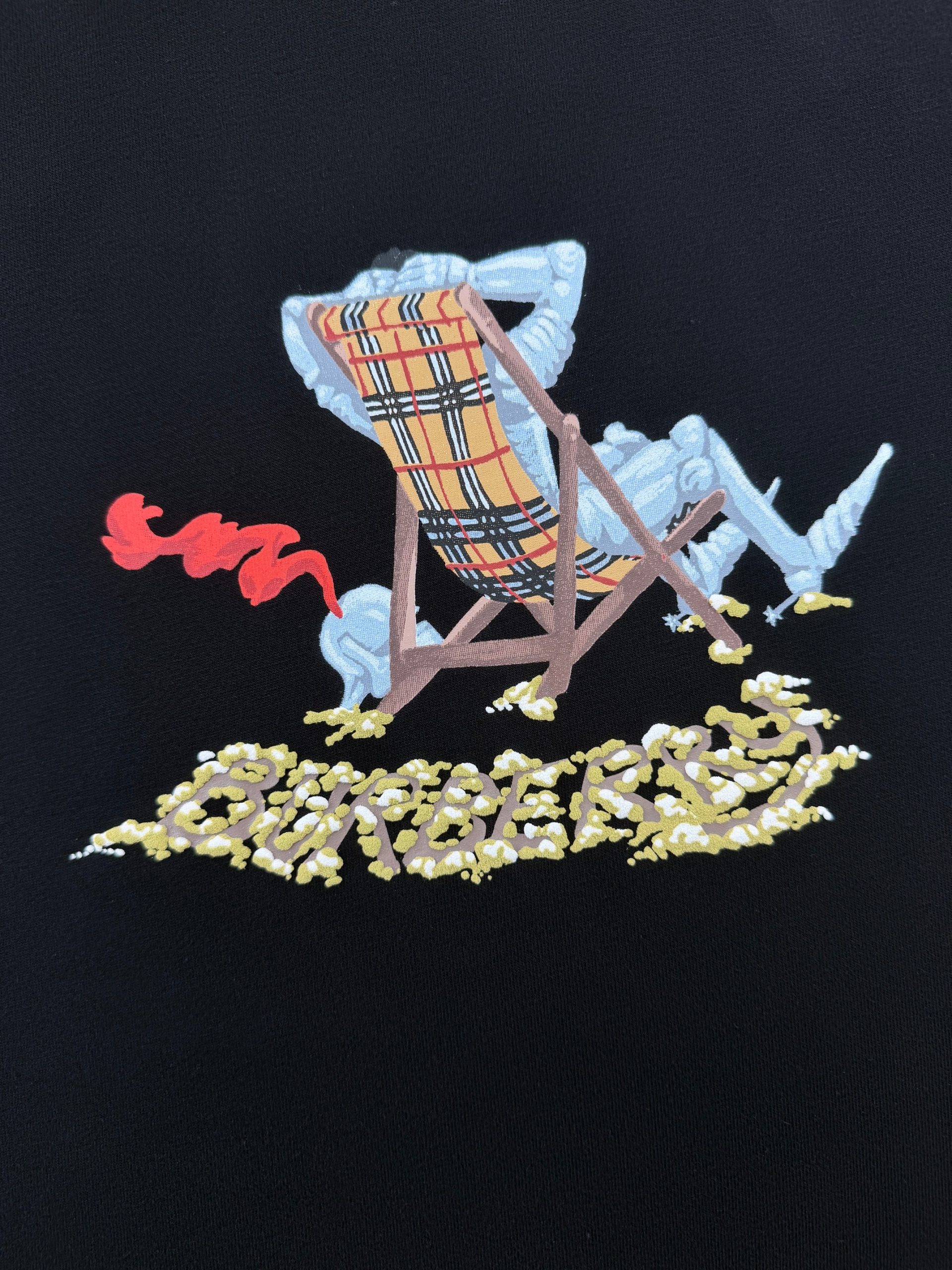 In terms of styling, the Burberry Knight T-Shirt works as a statement piece. It pairs easily with jeans, cargo pants, or shorts. Because of the graphic front, it does not need heavy layering—simple combinations already create a strong look.