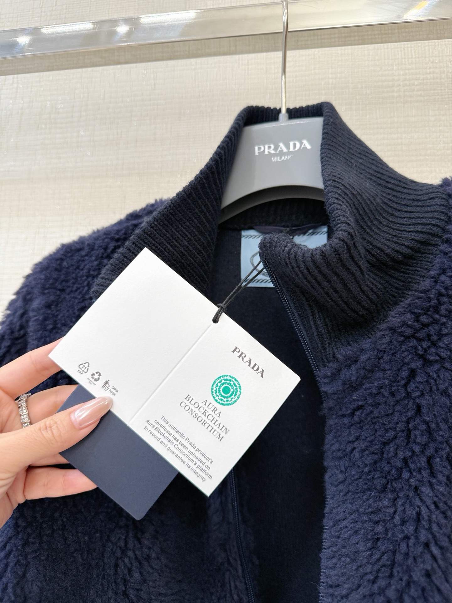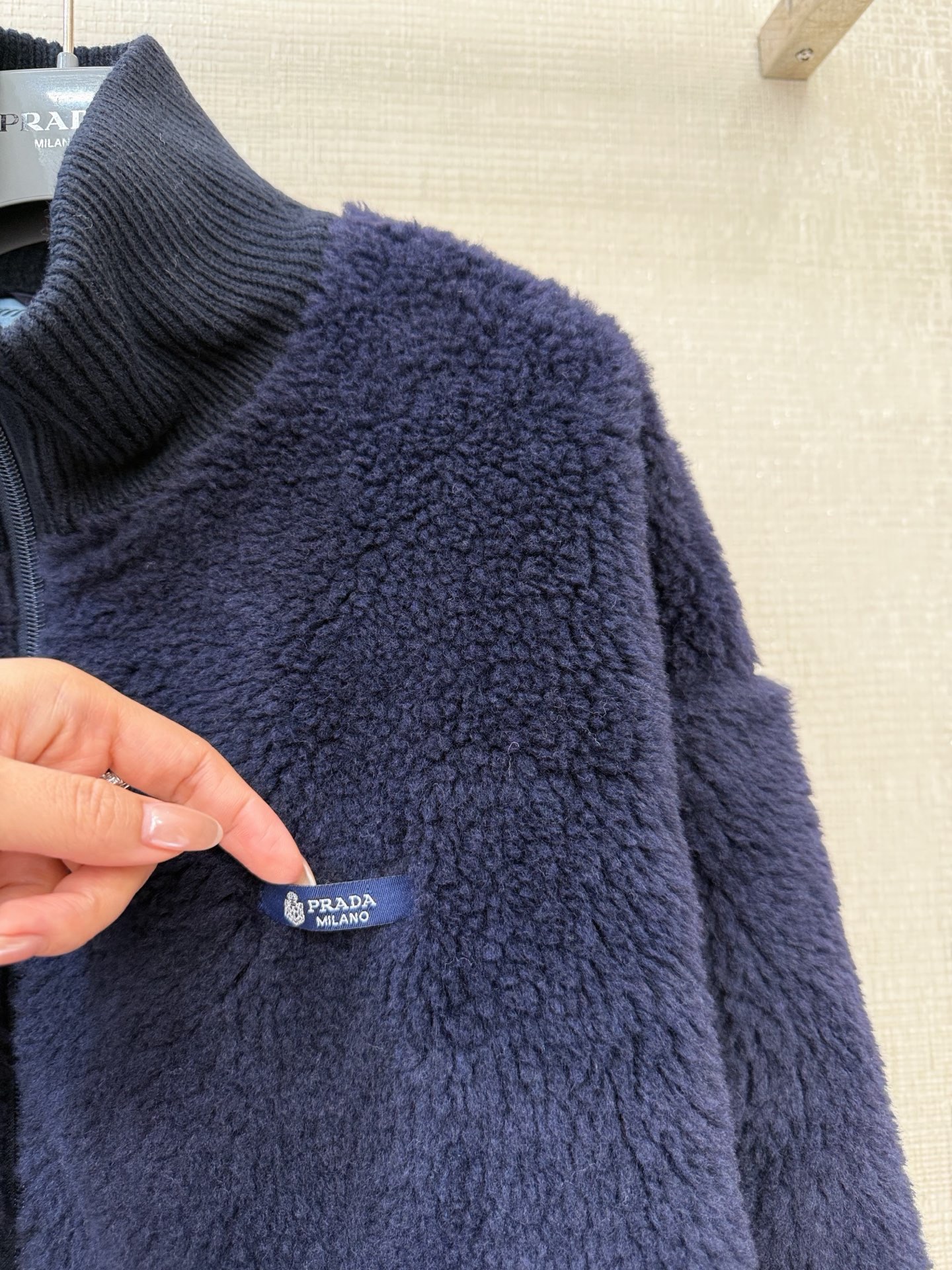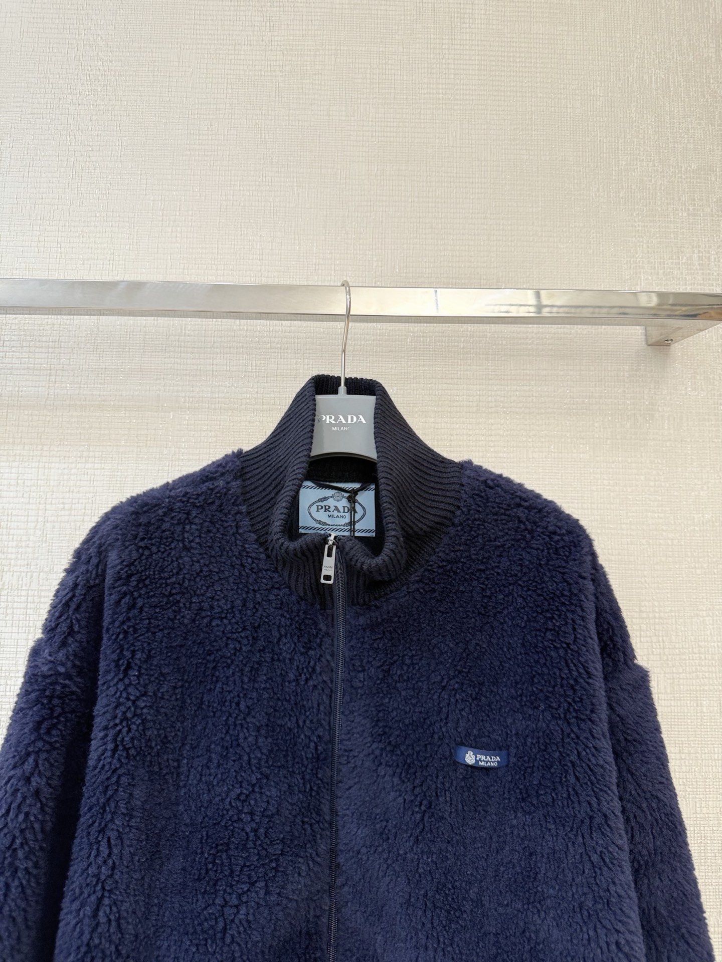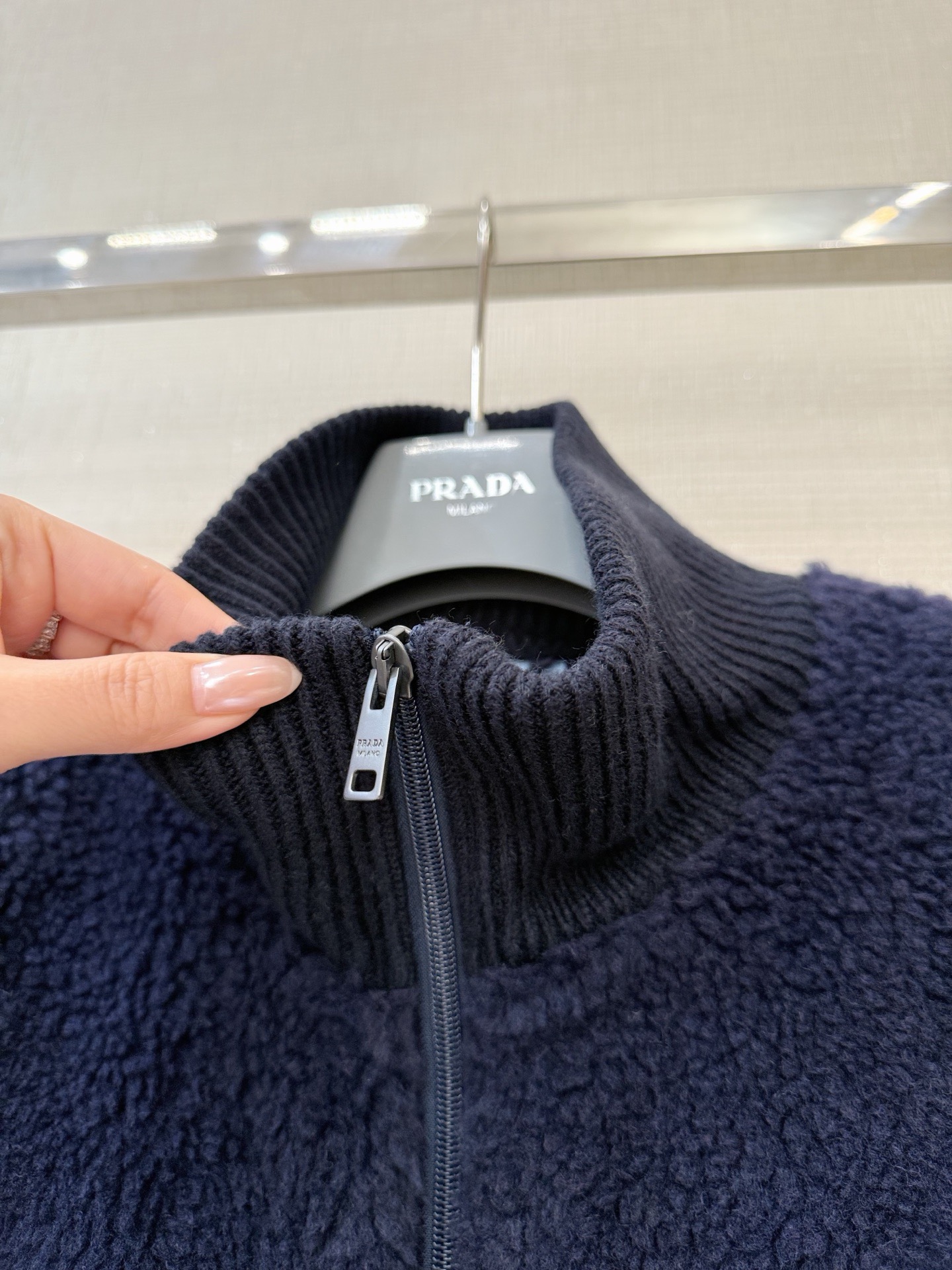 This top grade replica fleece jacket is crafted from premium fleece-effect material that feels warm and comfortable. The fabric provides insulation while remaining lightweight, which makes it suitable for daily use. In addition, the construction is clean and precise, reflecting the attention to detail found in high-quality replica clothing. As a result, this replica jacket closely mirrors the look and feel of original Prada fleece outerwear.